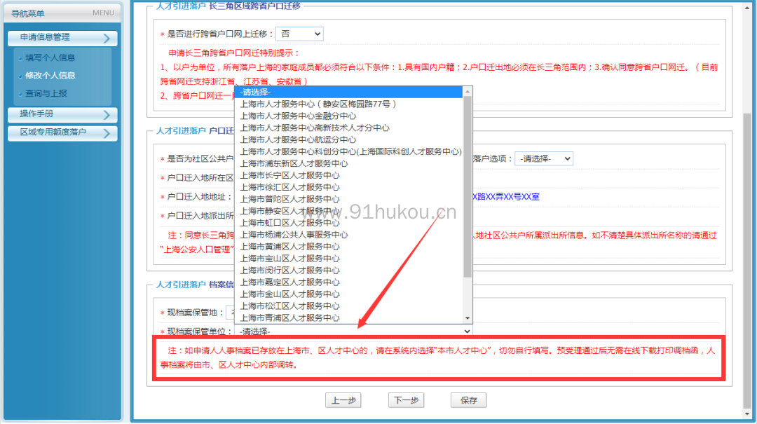 一网通办填报预审信息时,档案信息填写框下方会有红色提示语,<现档案保管地>请选择本市人才中心,然后在<现档案保管单位>下拉框里请直接选择目前档案所在的人才中心,如下图所示↓↓↓