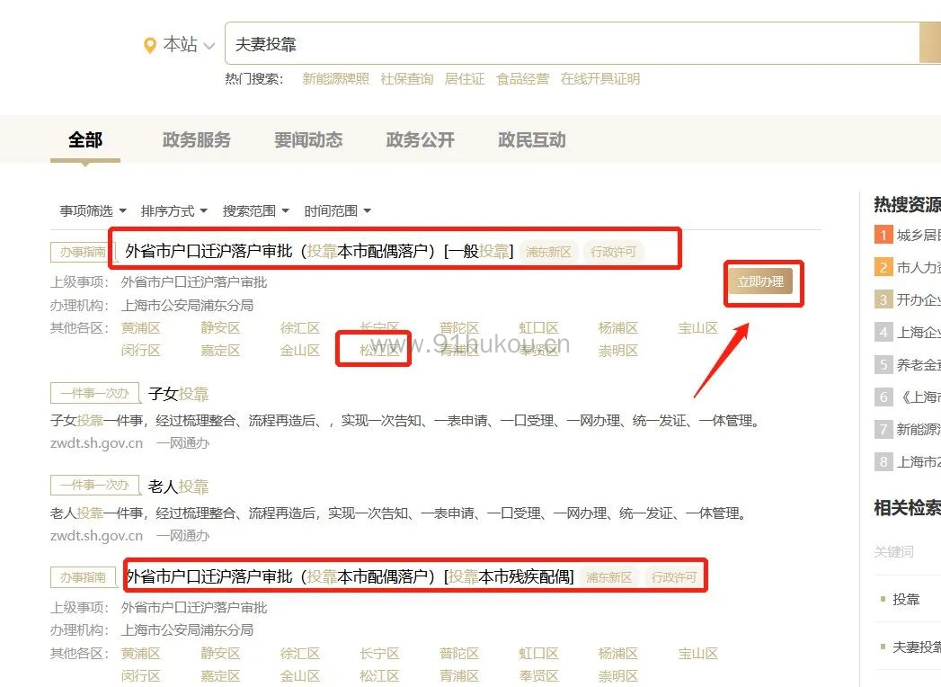 1. 打开“上海一网通办”官网,然后点击进入在首页搜索框中输入“夫妻投靠”搜索;