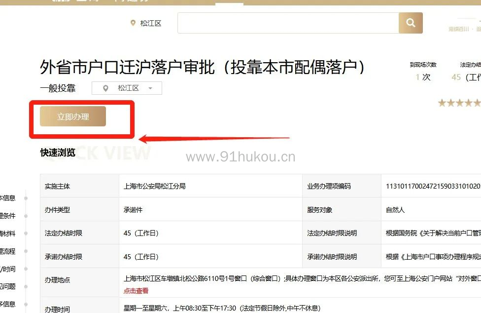 2. 选择办理投靠类型和落户所在地公安派出所,点击立即办理;