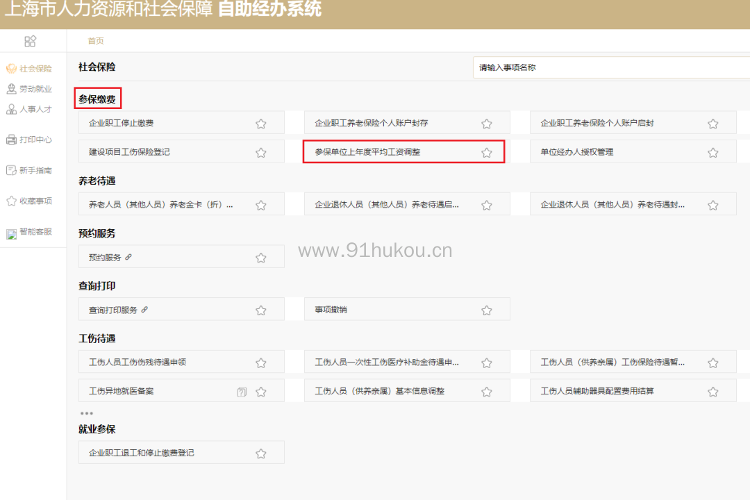 02 在“参保缴费”模块下找到“参保单位上年度平均工资调整”事项,或通过上方搜索栏输入“参保单位上年度平均工资调整”。