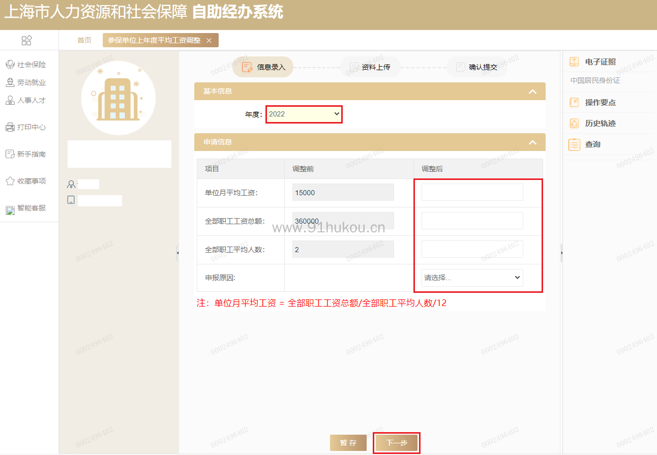 填写“基本信息”和“申请信息”。在“基本信息”栏目下选择需要申报调整的年度,在“申请信息”栏目下录入正确的单位月平均工资等信息。填写完成后点击“下一步”。
