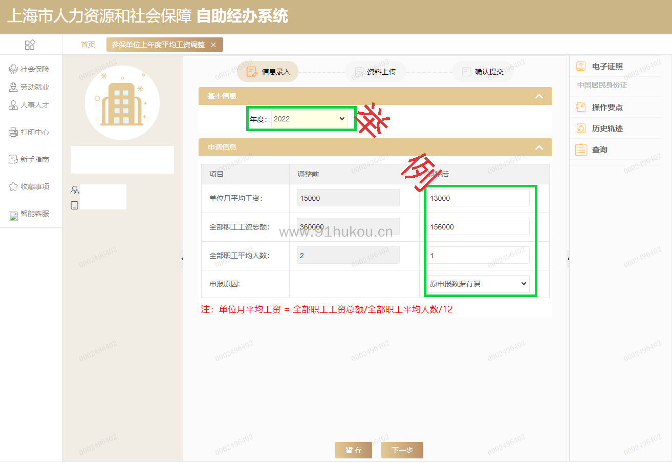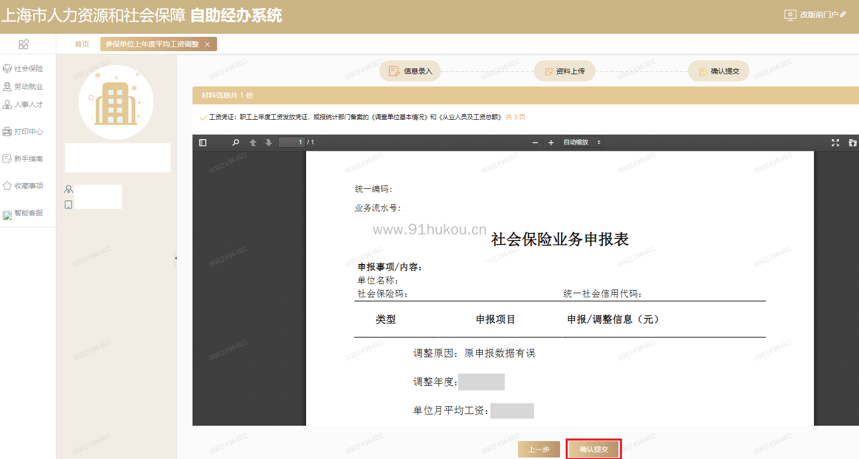 如果单位上年度平均工资数据申报完成后,发现申报数据有误,可通过“上海市人力资源和社会保障自助经办系统”线上申请调整,业务事项名称为“参保单位上年度平均工资调整”’。具体操作指南如下: