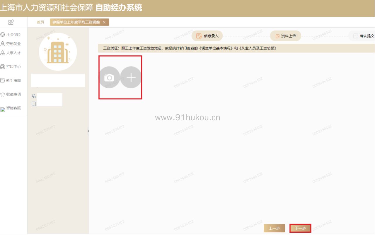 进入“资料上传”,按要求上传工资凭证:职工上年度工资发放凭证,或报统计部门备案的《调查单位基本情况》和《从业人员及工资总额》。点击拍照或添加按钮上传资料,上传完成后,点击“下一步”。