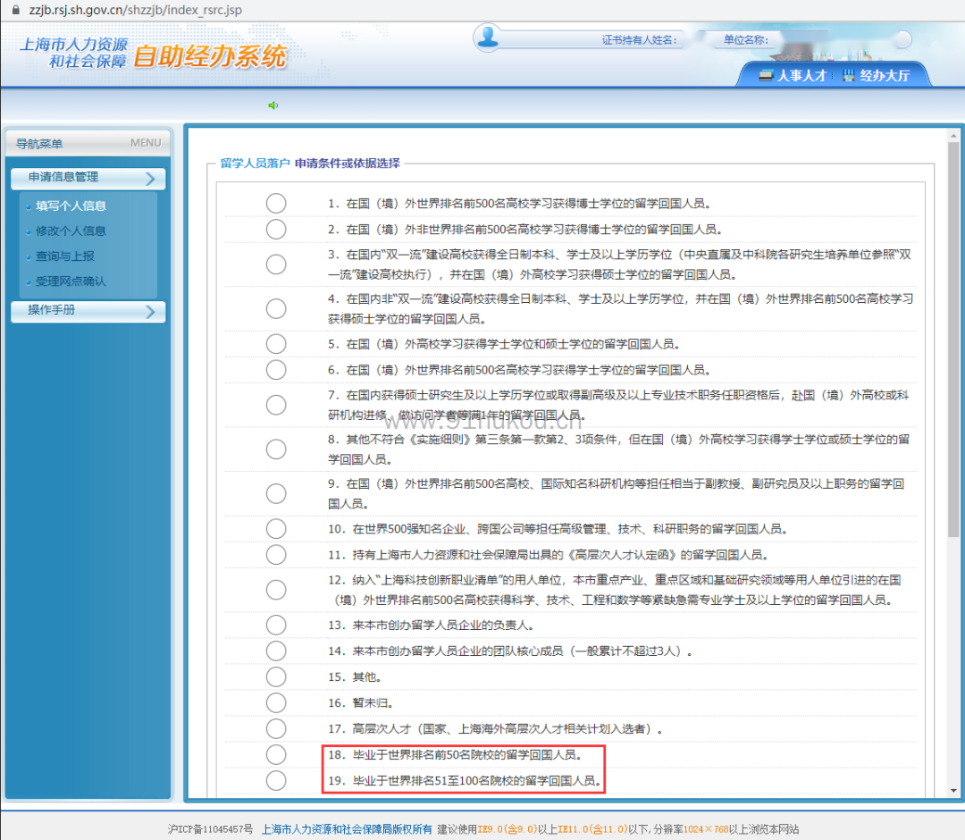 3. 输入身份证号码,可见最新的申请条件更新为最新的19类