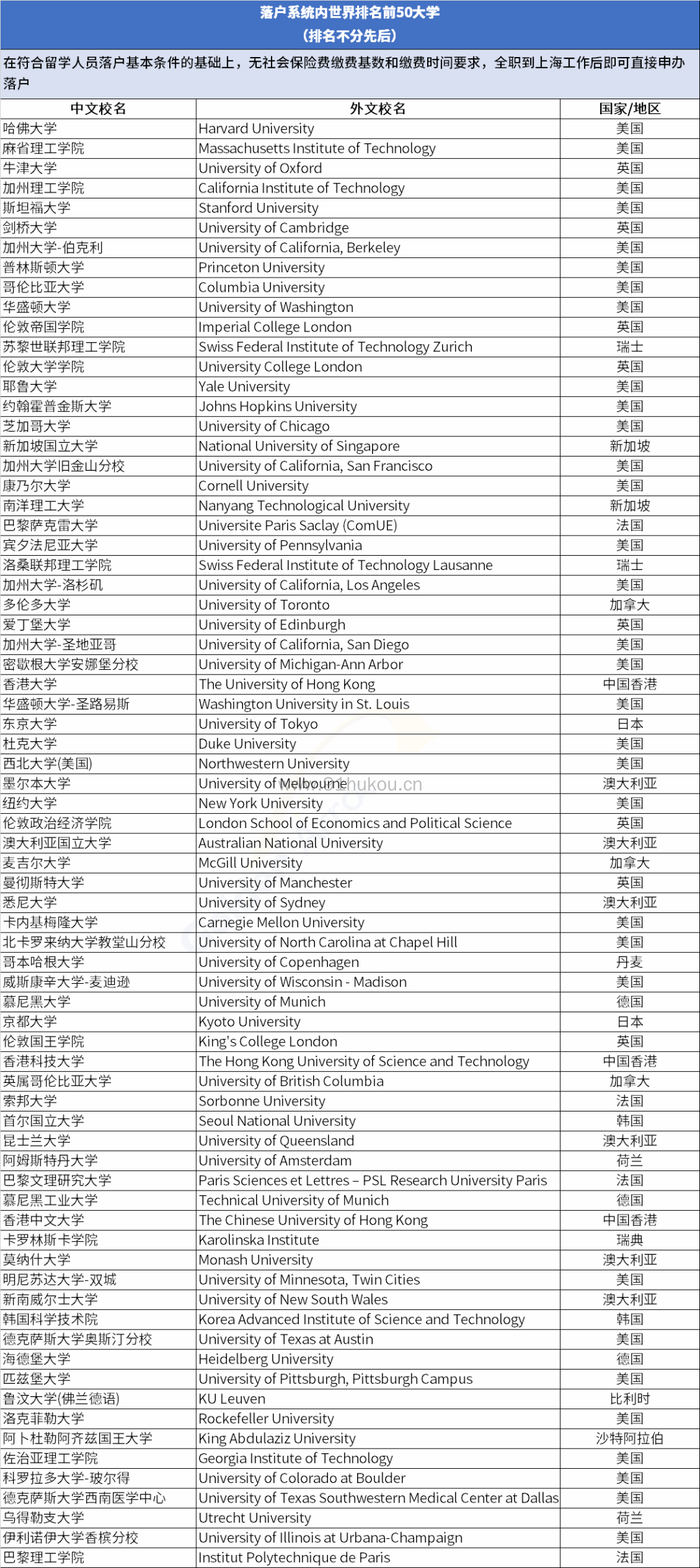 TOP50共有73所院校,在名单里的朋友,来上海全职工作可以直接落户;